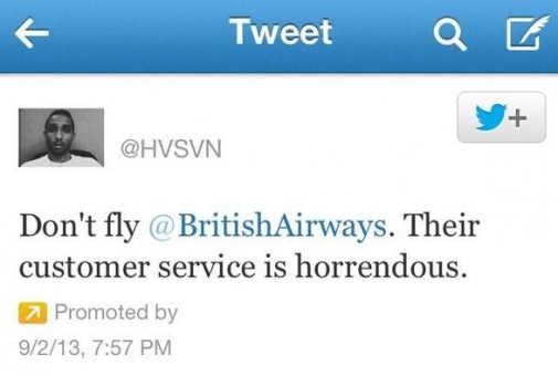 L’esperimento della BBC anticipa infatti la vicenda -che lo scorso mese ha fatto il giro della rete- che vede protagonista l’imprenditore Hasan Syed contro la British Airways. Stanco della scarsa attenzione riservata dall’assistenza clienti di BA alla ricerca dei bagagli smarriti del padre, Hasan Syed decide di manifestare il proprio disappunto sul profilo Twitter della compagnia ma, anche in questo caso, non ottiene l’esito atteso. Esasperato dalla situazione, Syed decide quindi di comprare un promoted tweet – strumento di solito utilizzato dalle aziende a scopo pubblicitario- per dare una risonanza “worldwide” alla propria protesta contro British Airways.